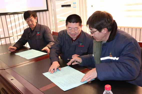 公司總經理佟國山、公司副總經理兼工會主席邱延軍與生產單位簽訂2016年安全生產目標責任狀